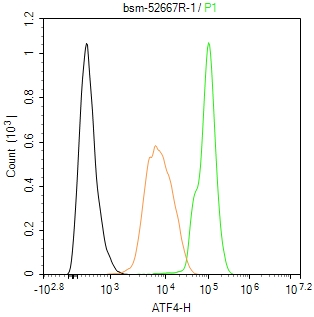 The Hela (tunicamycin-treated (2μg/ml, 8h)) (H) cells were fixed with 4% PFA (10 min at r.t.) and then permeabilized with 90% ice-cold methanol for 20 min at -20℃,the cells then were incubated in 5%BSA to block non-specific protein-protein interactions (30 min at r.t.), followed by secondary antibody incubation for 40 min at room temperature. Primary Antibody (green):Rabbit Anti-ATF4 antibody (bsm-52667R,1:100); Isotype Control (orange): Rabbit IgG (bs-0295P). Blank control (black): PBS. Acquisition of 20,000 events was performed.