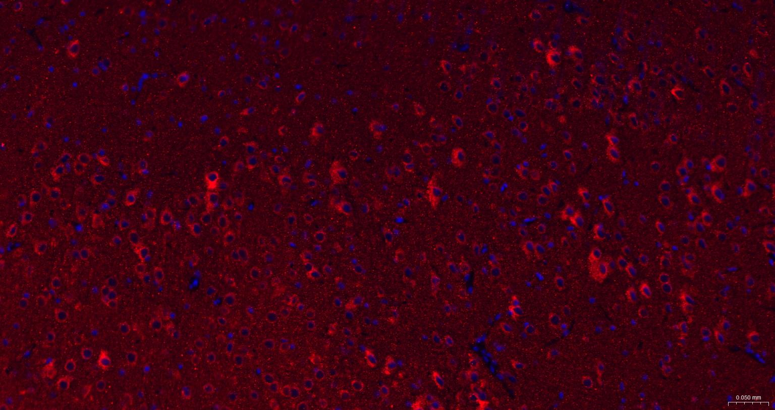 Paraformaldehyde-fixed, paraffin embedded Rat Cerebrum; Antigen retrieval by boiling in sodium citrate buffer (pH6.0) for 15 min; The section was incubated with SQSTM1/p62 Monoclonal Antibody, Unconjugated (bs-55207R) at 1:200 overnight at 4°C. Followed by conjugated Goat Anti-Rabbit IgG antibody (Red, bs-0295G-BF594), DAPI (blue, C02-04002) was used to stain the cell nuclei.