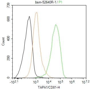 The THP-1 (H) cells were incubated in 5%BSA to block non-specific protein-protein interactions (30 min at r.t.) , followed by secondary antibody incubation for 40 min at room temperature. Primary Antibody (green): Rabbit Anti-TAPA1/CD81 antibody (bsm-52640R): 1 μg/10^6 cells; Isotype Control (orange): Rabbit IgG (bs-0295P). Blank control (black): PBS. Acquisition of 20,000 events was performed.
