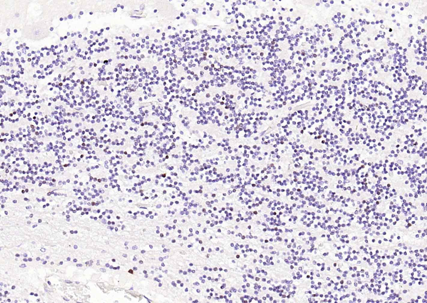 Paraformaldehyde-fixed, paraffin embedded (rat cerebellum); Antigen retrieval by boiling in sodium citrate buffer (pH6.0) for 15min; Block endogenous peroxidase by 3% hydrogen peroxide for 20 minutes; Blocking buffer (normal goat serum) at 37°C for 30min; Incubation with (NeuN) Monoclonal Antibody, Unconjugated (bsm-52268R) at 1:200 overnight at 4°C, followed by operating according to SP Kit(Rabbit) (sp-0023)instructionsand DAB staining.