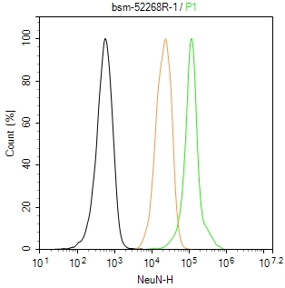 The SH-SY5Y (H) cells were fixed with 4% PFA (10 min at r.t.) and then permeabilized with 90% ice-cold methanol for 20 min at -20℃,the cells then were incubated in 5%BSA to block non-specific protein-protein interactions (30 min at r.t.), followed by secondary antibody incubation for 40 min at room temperature. Primary Antibody (green):Rabbit Anti-NeuN antibody (bsm-52268R,1:100); Isotype Control (orange): Rabbit IgG (bs-0295P). Blank control (black): PBS. Acquisition of 20,000 events was performed.