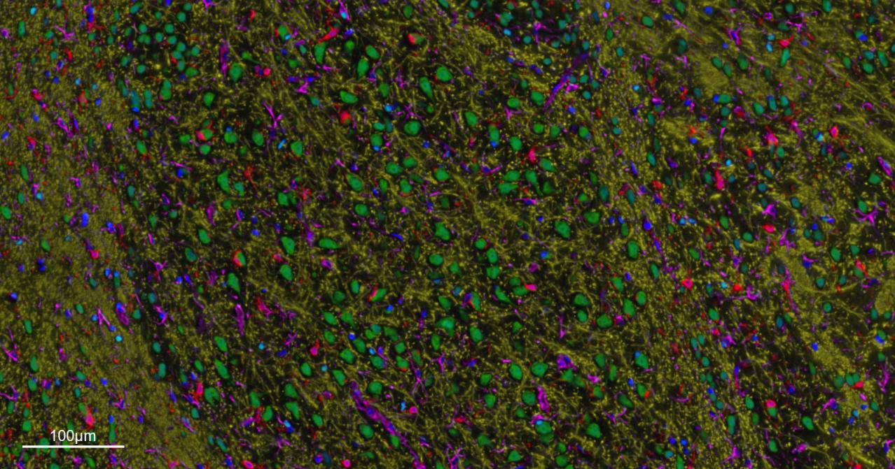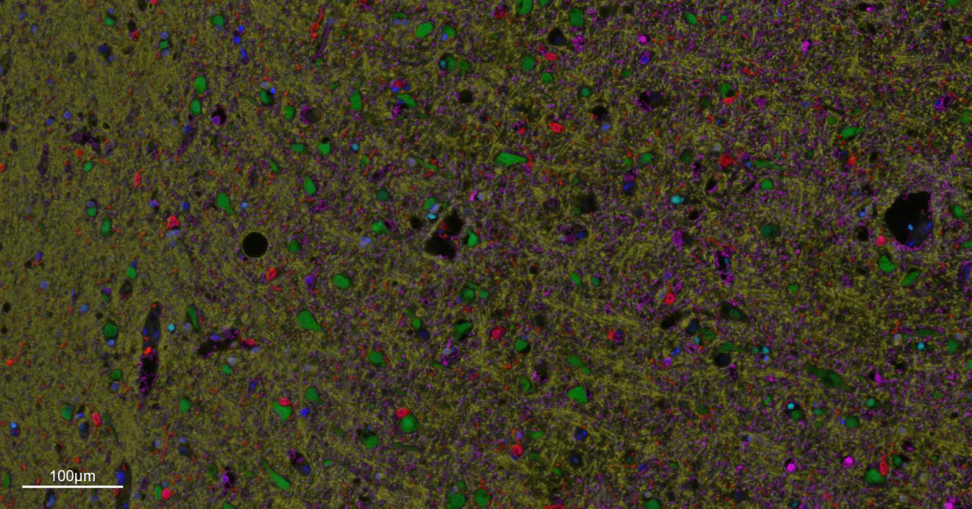 Merged staining of anti-GFAP (bsm-42001R; 1:200; pink) anti-AIF1/Iba1 (bsm-54132R; 1:200; red) anti-NeuN (bsm-52268R; 1:200; green) anti-MBP (bsm-33932M; 1:200; yellow) and anti-Olig2 (bsm-61115R; 1:200; light blue) .