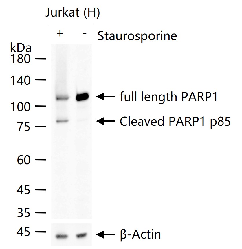 Jurkat (H) cells were treated with or without Staurosporine (1µM) for 4 h, 25 μg total protein per lane of cell lysates (see on figure) probed with Cleaved PARP1 p85 monoclonal antibody, unconjugated (bsm-52408R) at 1:1000 dilution and 4°C overnight incubation. Followed by conjugated secondary antibody incubation at r.t. for 60 min.