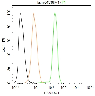 The Jurkat (H) cells were fixed with 4% PFA (10 min at r.t.) and then permeabilized with 90% ice-cold methanol for 20 min at -20℃,the cells then were incubated in 5%BSA to block non-specific protein-protein interactions (30 min at r.t.), followed by secondary antibody incubation for 40 min at room temperature. Primary Antibody (green):Rabbit Anti-CAMK4 antibody (bsm-54336R,1:100); Isotype Control (orange): Rabbit IgG (bs-0295P). Blank control (black): PBS. Acquisition of 20,000 events was performed.