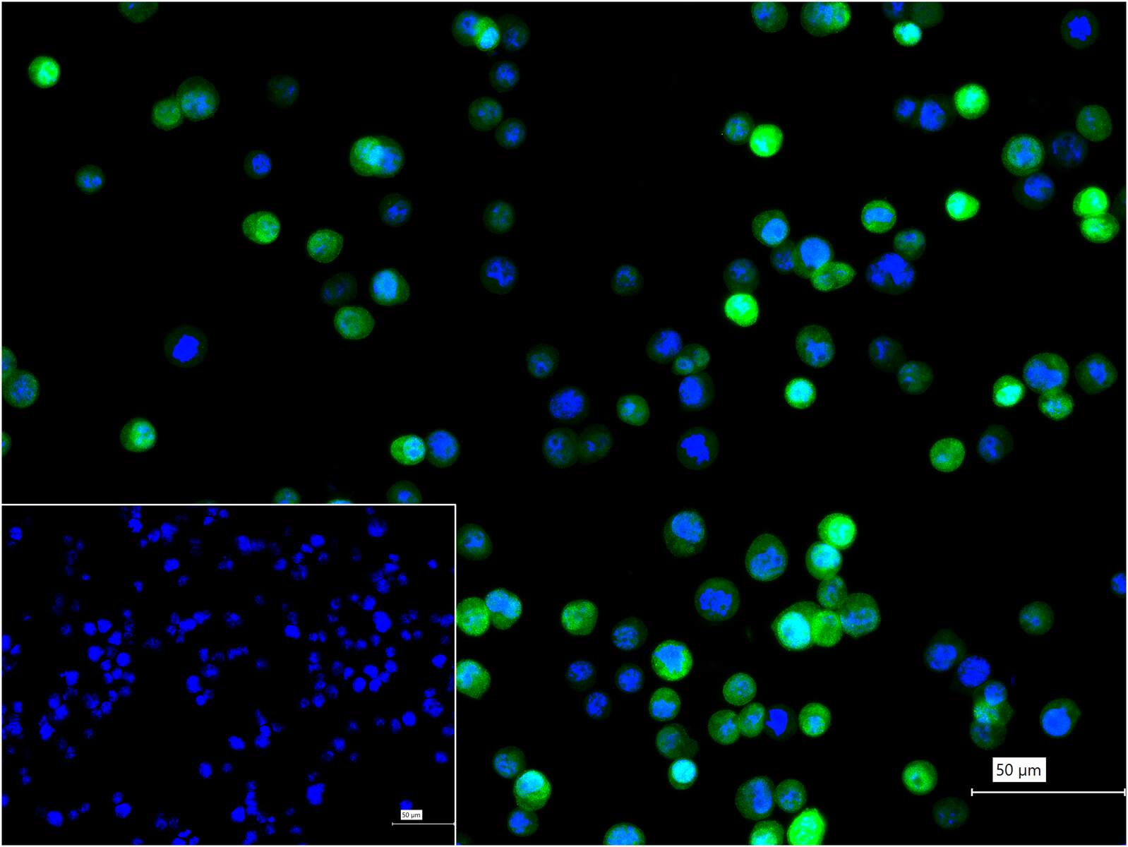 4% Paraformaldehyde-fixed Jurkat (H) cell; Triton X-100 at r.t. for 20 min; Antibody incubation with (CAMK4) monoclonal Antibody, unconjugated (bsm-54336R) 1:100, 90 min at 37°C; followed by BF488 conjugated Goat Anti-Rabbit IgG antibody (green, bs-60295G-BF488) at 37°C for 90 min, DAPI (blue, C02-04002) was used to stain the cell nuclei. PBS instead of the primary antibody was used as the blank control.