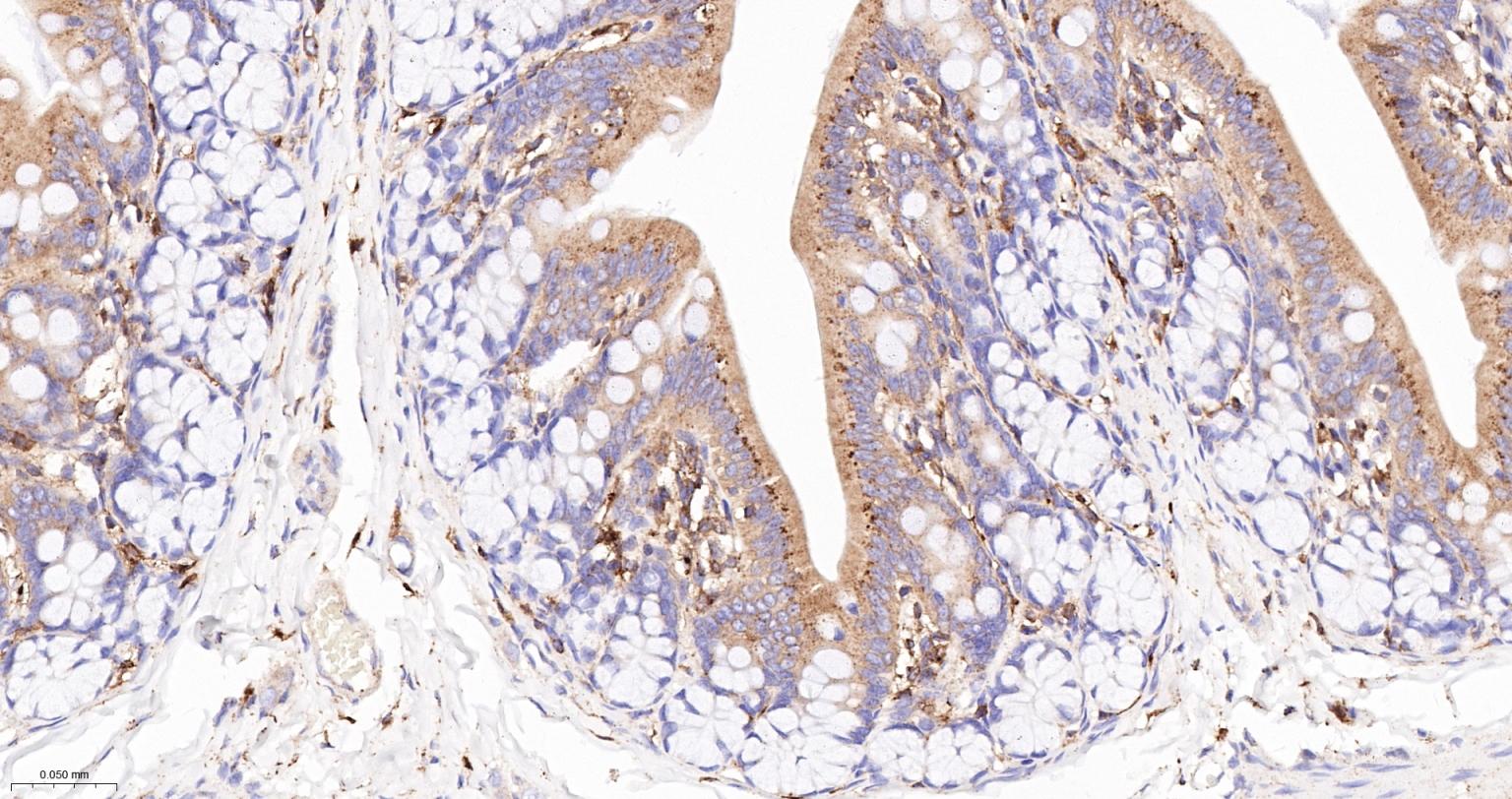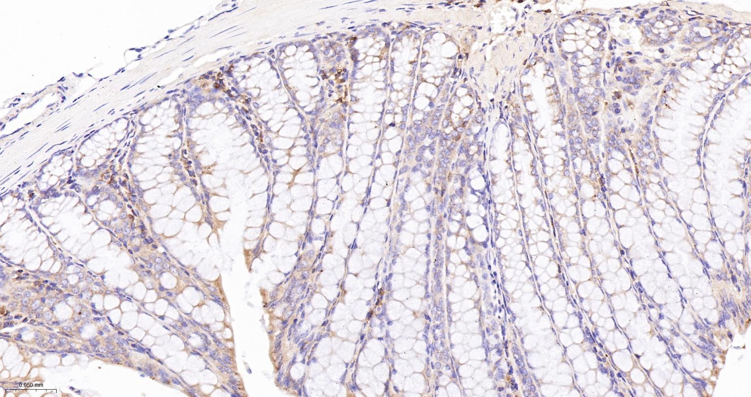 Paraformaldehyde-fixed, paraffin embedded Mouse Colon; Antigen retrieval by boiling in sodium citrate buffer (pH6.0) for 15 min; The section was incubated with ARP3 Monoclonal Antibody, Unconjugated (bsm-54337R) at 1:100 overnight at 4°C, followed by conjugation to the bs-0295G-HRP and DAB (C-0010) staining.