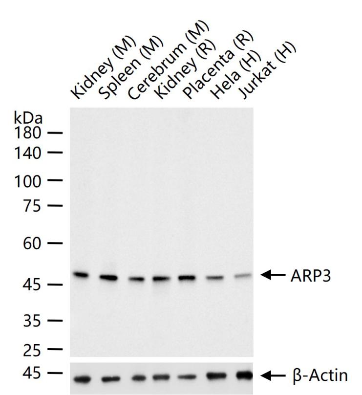 25 ug total protein per lane of various lysates (see on figure) probed with ARP3 monoclonal antibody, unconjugated (bsm-54337R) at 1:500 dilution and 4°C overnight incubation. Followed by conjugated secondary antibody incubation at r.t. for 60 min.