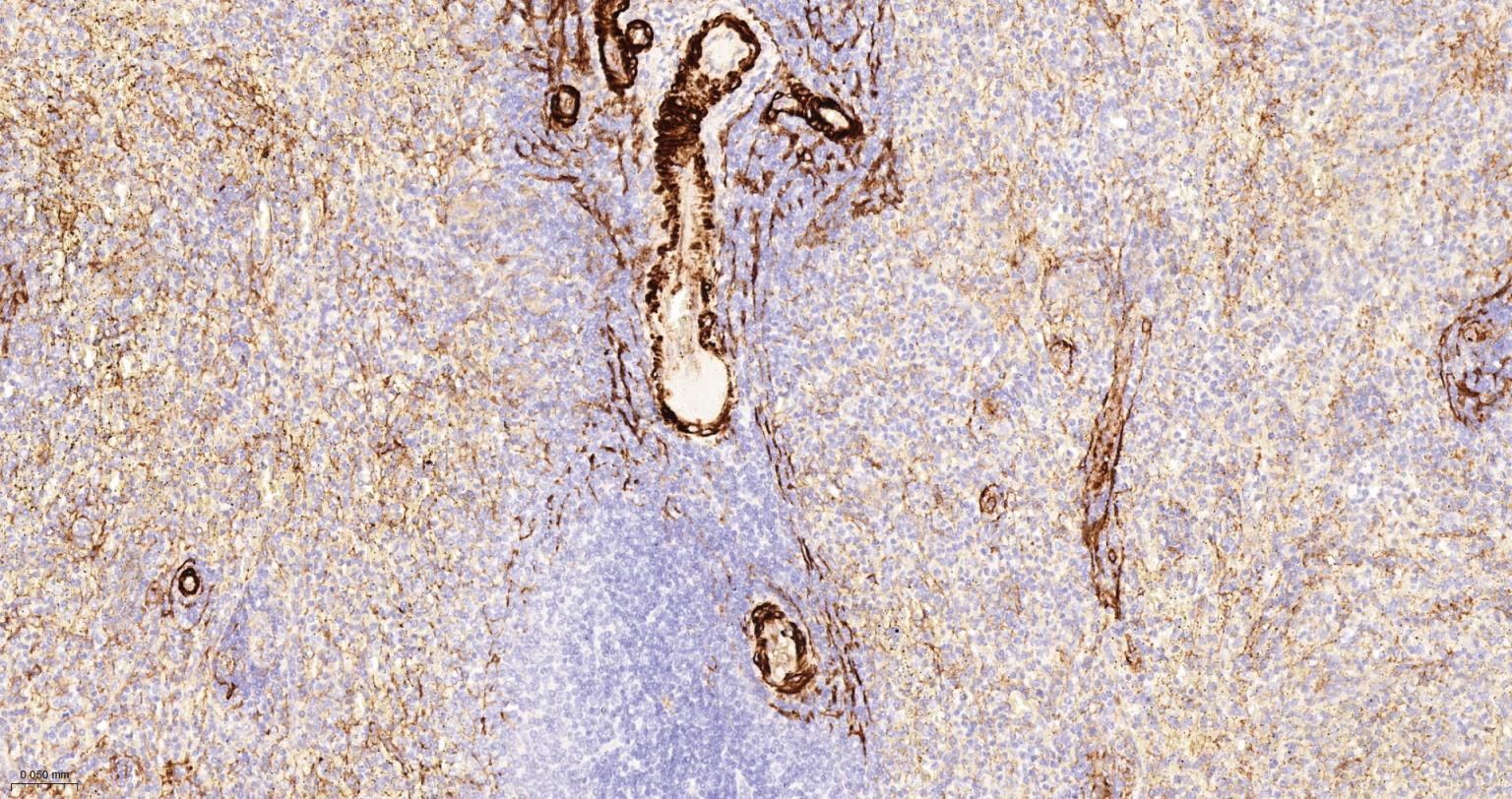 Paraformaldehyde-fixed, paraffin embedded Human Spleen; Antigen retrieval by boiling in sodium citrate buffer (pH6.0) for 15 min; The section was incubated with CD105 Polyclonal Antibody, Unconjugated (bs-34063R) at 1:200 overnight at 4°C, followed by conjugation to the bs-0295G-HRP and DAB (C-0010) staining.
