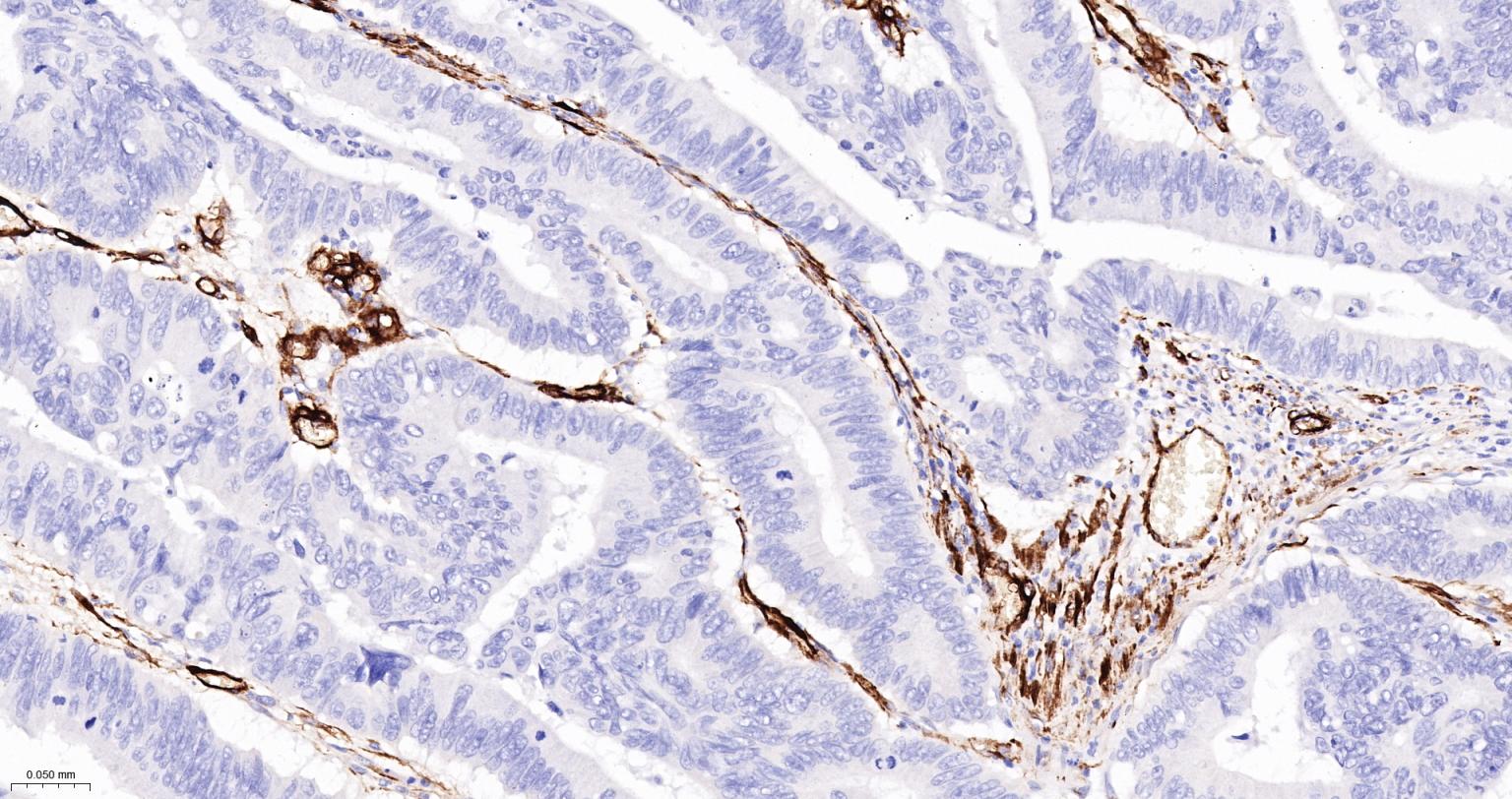 Paraformaldehyde-fixed, paraffin embedded Human Colon Cancer; Antigen retrieval by boiling in sodium citrate buffer (pH6.0) for 15 min; The section was incubated with CD105 Polyclonal Antibody, Unconjugated (bs-34063R) at 1:200 overnight at 4°C, followed by conjugation to the bs-0295G-HRP and DAB (C-0010) staining.