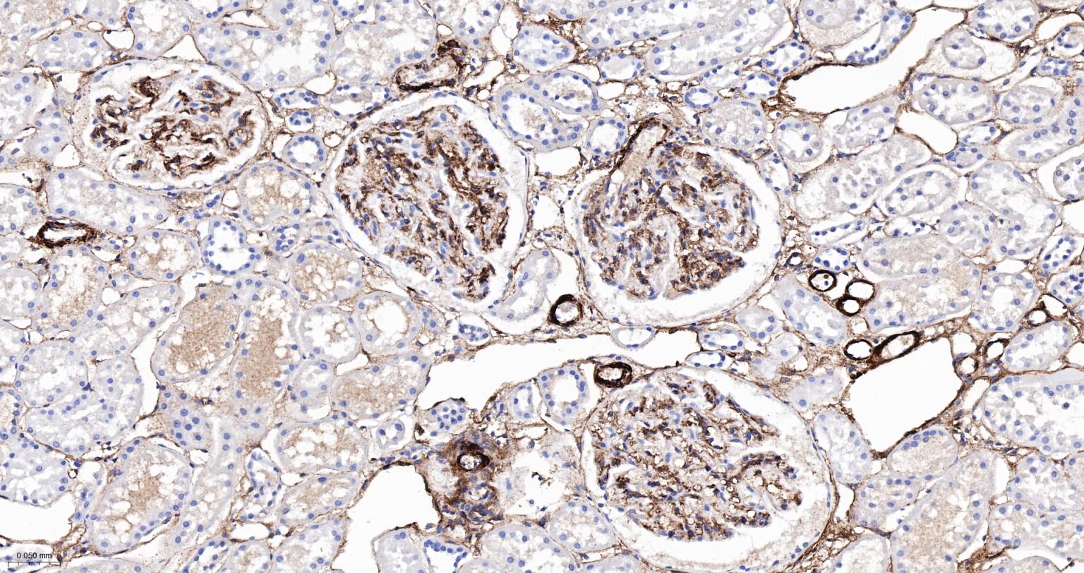 Paraformaldehyde-fixed, paraffin embedded Human Kidney; Antigen retrieval by boiling in sodium citrate buffer (pH6.0) for 15 min; The section was incubated with CD105 Polyclonal Antibody, Unconjugated (bs-34063R) at 1:200 overnight at 4°C, followed by conjugation to the bs-0295G-HRP and DAB (C-0010) staining.