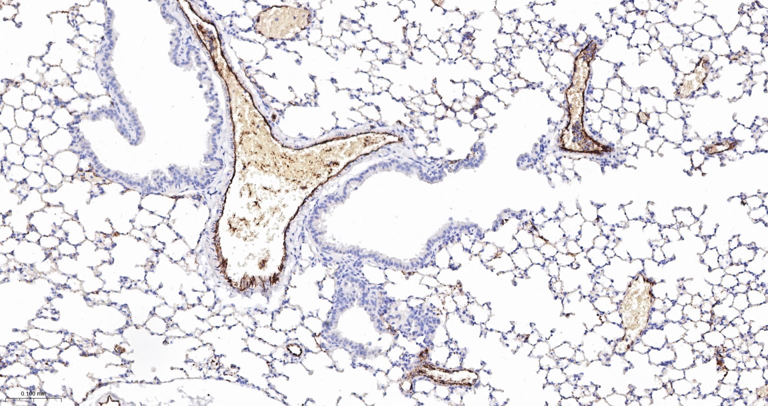 Paraformaldehyde-fixed, paraffin embedded Mouse Lung; Antigen retrieval by boiling in sodium citrate buffer (pH6.0) for 15 min; Antibody incubation with VWF Monoclonal Antibody, Unconjugated(bsm-52775R) at 1:1000 overnight at 4°C, followed by conjugation to the bs-0295G-HRP and DAB (C-0010) staining.