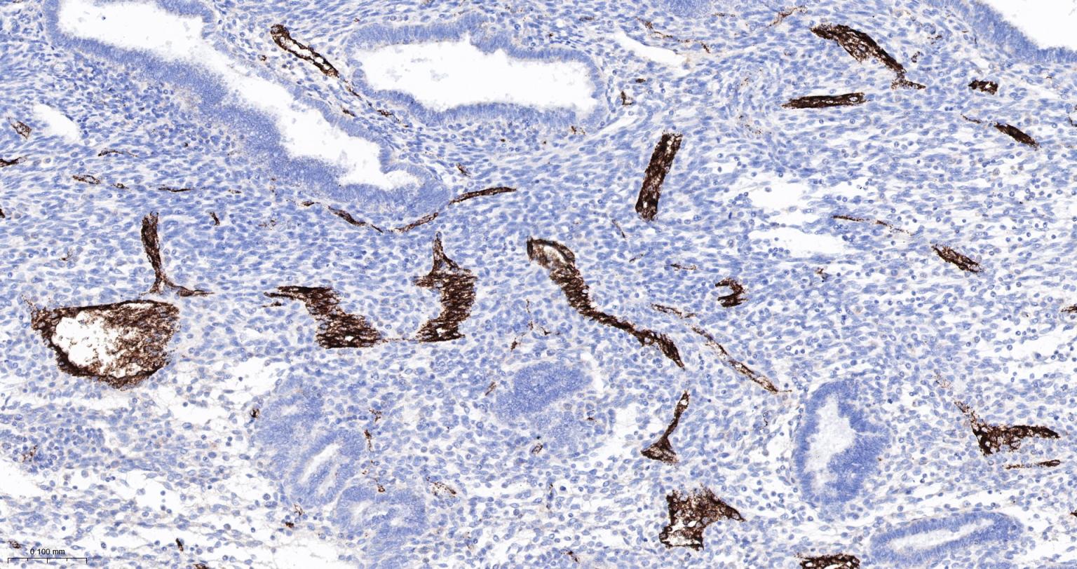 Paraformaldehyde-fixed, paraffin embedded Human Uterus; Antigen retrieval by boiling in sodium citrate buffer (pH6.0) for 15 min; Antibody incubation with VWF Monoclonal Antibody, Unconjugated(bsm-52775R) at 1:200 overnight at 4°C, followed by conjugation to the bs-0295G-HRP and DAB (C-0010) staining.