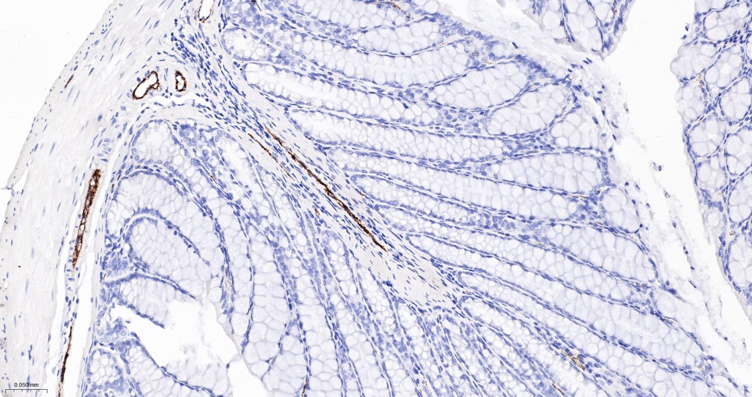 Paraformaldehyde-fixed, paraffin embedded Mouse Colon; Antigen retrieval by boiling in sodium citrate buffer (pH6.0) for 15 min; Antibody incubation with VWF Monoclonal Antibody, Unconjugated(bsm-52775R) at 1:1000 overnight at 4°C, followed by conjugation to the bs-0295G-HRP and DAB (C-0010) staining.