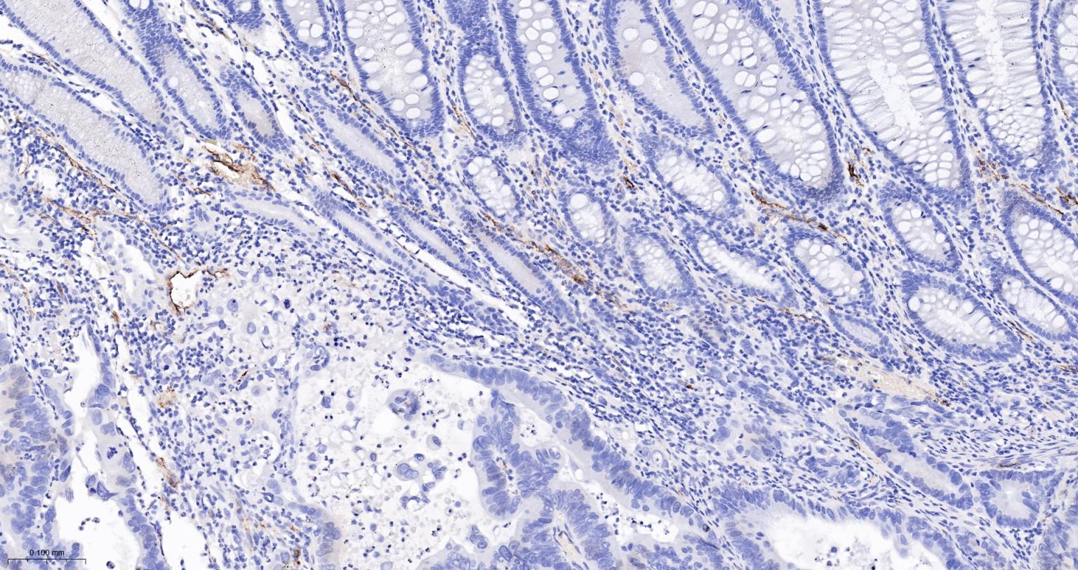 Paraformaldehyde-fixed, paraffin embedded Human Colon Cancer; Antigen retrieval by boiling in sodium citrate buffer (pH6.0) for 15 min; Antibody incubation with VWF Monoclonal Antibody, Unconjugated(bsm-52775R) at 1:1000 overnight at 4°C, followed by conjugation to the bs-0295G-HRP and DAB (C-0010) staining.
