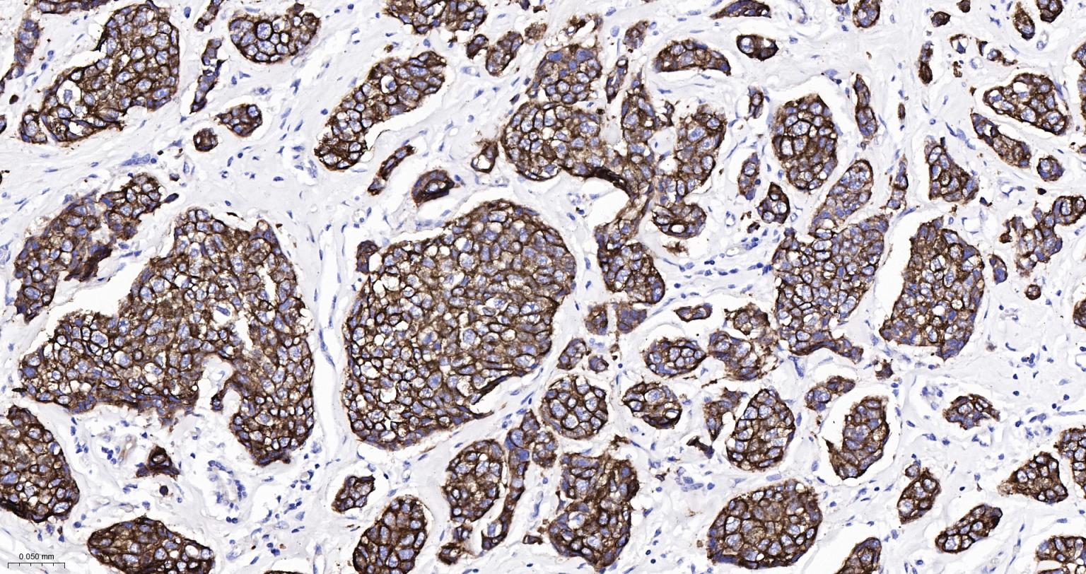 Paraformaldehyde-fixed, paraffin embedded Human Breast Cancer; Antigen retrieval by boiling in sodium citrate buffer (pH6.0) for 15 min; The section was incubated with E cadherin Monoclonal Antibody, Unconjugated (bsm-51351M) at 1:1000 overnight at 4°C, followed by conjugation to the bs-40296G-HRP and DAB (C-0010) staining.