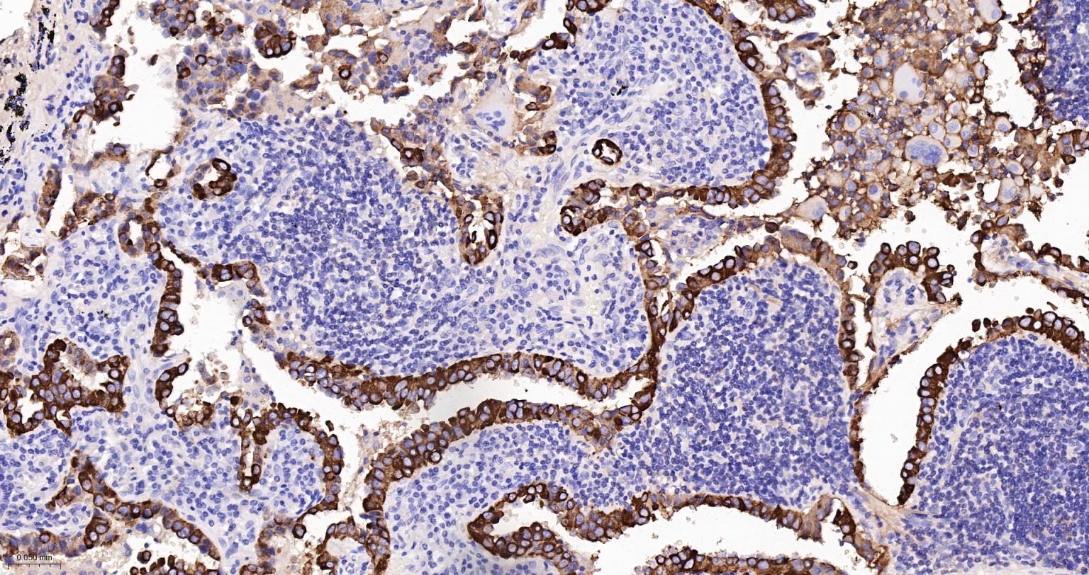 Paraformaldehyde-fixed, paraffin embedded Human Lung Cancer; Antigen retrieval by boiling in sodium citrate buffer (pH6.0) for 15 min; The section was incubated with E cadherin Monoclonal Antibody, Unconjugated (bsm-51351M) at 1:1000 overnight at 4°C, followed by conjugation to the bs-40296G-HRP and DAB (C-0010) staining.