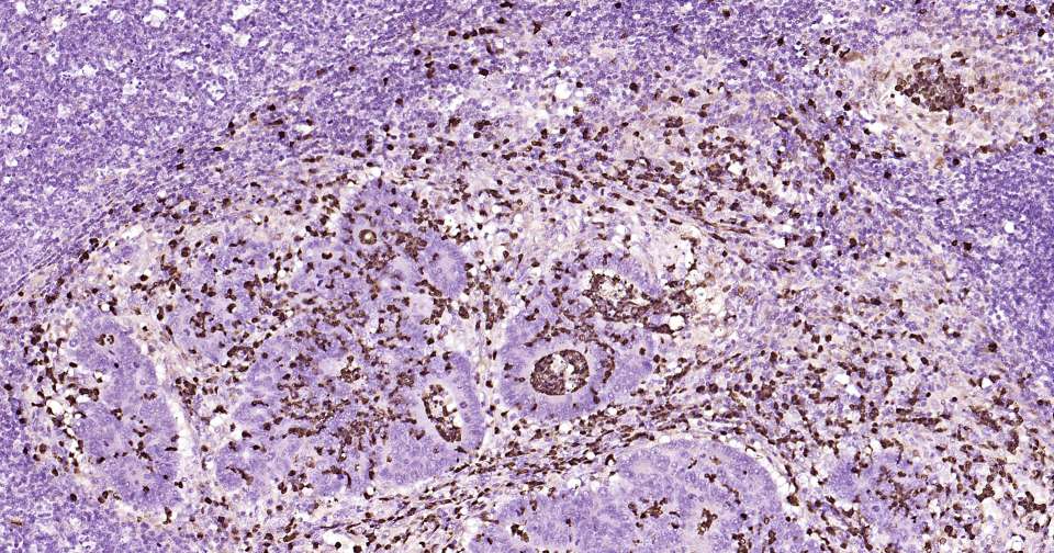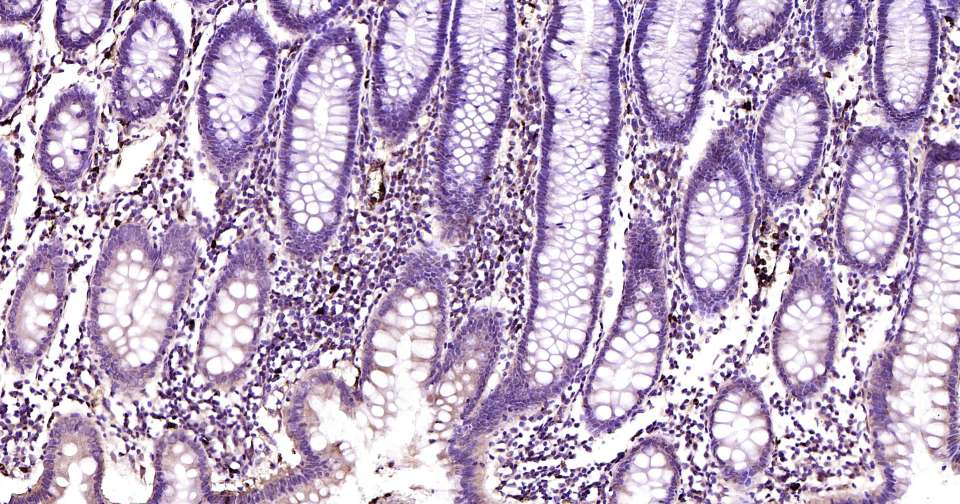 Immunohistochemical analysis of paraffin embedded human colon cancer tissue slide using IHC0404H (Human JNK1/3 IHC Kit).