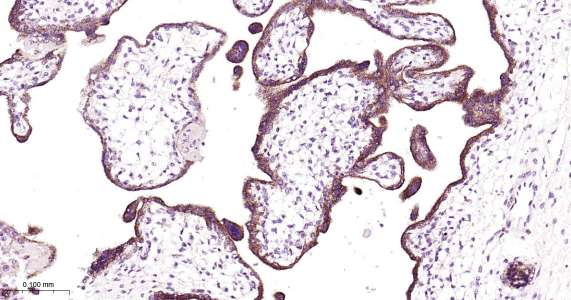 Immunohistochemical analysis of paraffin embedded human placenta tissue slide using IHC0407H (Human phospho-EGFR (Ser695) IHC Kit).