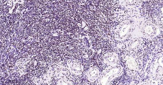 Immunohistochemical analysis of paraffin embedded human ovary tissue slide using IHC0411H (Human Pokemon/ZBTB7A IHC Kit).
