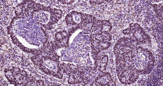 Immunohistochemical analysis of paraffin embedded human colon cancer tissue slide using IHC0411H (Human Pokemon/ZBTB7A IHC Kit).