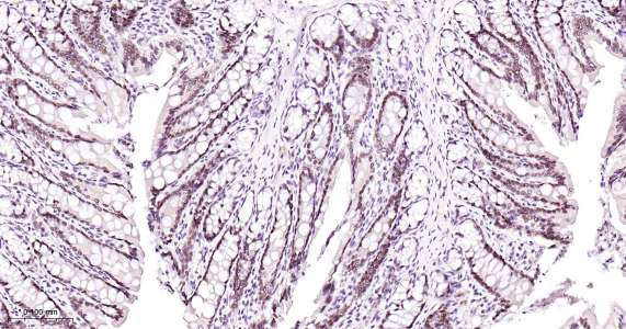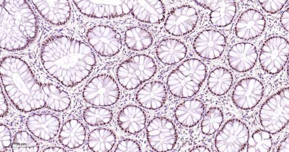 Immunohistochemical analysis of paraffin embedded human colon tissue slide using IHC0413 (HNF4A IHC Kit).