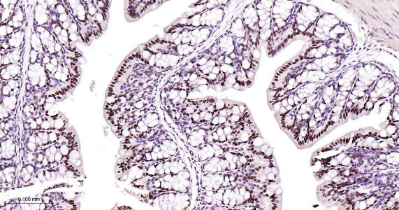 Immunohistochemical analysis of paraffin embedded mouse colon tissue slide using IHC0413 (HNF4A IHC Kit).