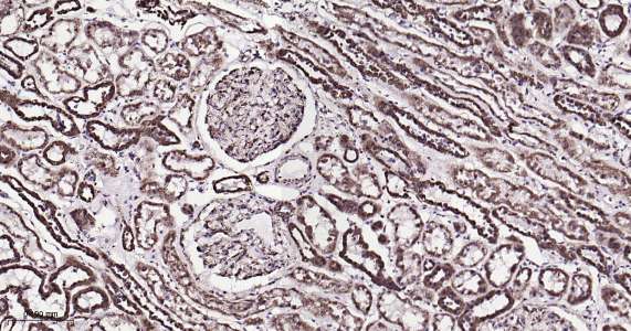 Immunohistochemical analysis of paraffin embedded human kidney tissue slide using IHC0418 (ATP5A IHC Kit).