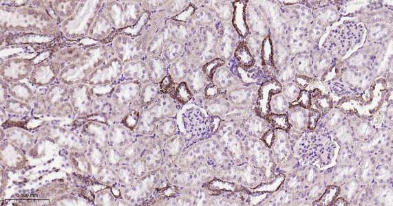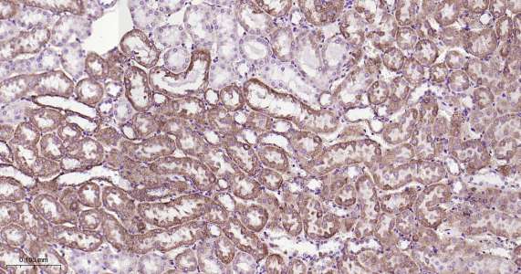 Immunohistochemical analysis of paraffin embedded mouse kidney tissue slide using IHC0418 (ATP5A IHC Kit).