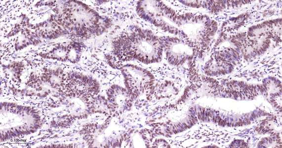 Immunohistochemical analysis of paraffin embedded human colon cancer tissue slide using IHC0429H (Human TARDBP IHC Kit).