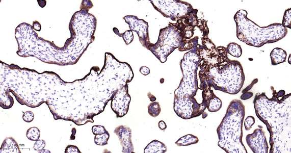 Immunohistochemical analysis of paraffin embedded human placenta tissue slide using IHC0432H (Human Placental alkaline phosphatase (PLAP) IHC Kit).