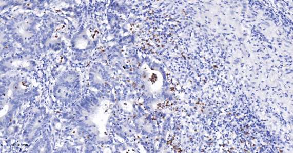 Immunohistochemical analysis of paraffin embedded human colon cancer tissue slide using IHC0435H (Human Arginase 1 IHC Kit).