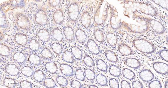 Immunohistochemical analysis of paraffin embedded human colon tissue slide using IHC0455H (Human PP-1B IHC Kit).