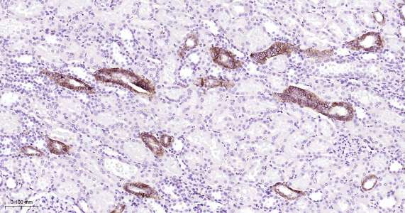 Immunohistochemical analysis of paraffin embedded human kidney tissue slide using IHC0478H (Human CD171/L1CAM IHC Kit).