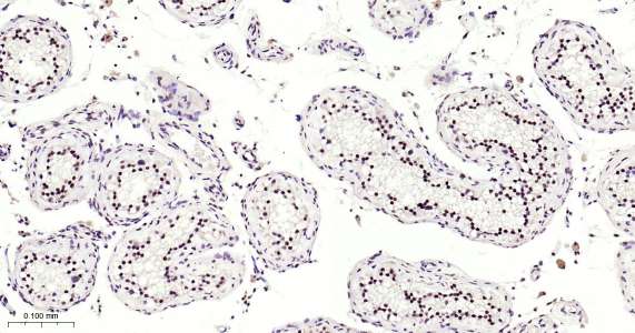 Immunohistochemical analysis of paraffin embedded human testis tissue slide using IHC0492 (METTL3 IHC Kit).