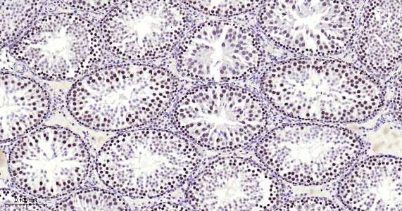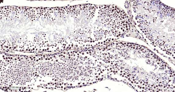 Immunohistochemical analysis of paraffin embedded mouse testis tissue slide using IHC0492 (METTL3 IHC Kit).