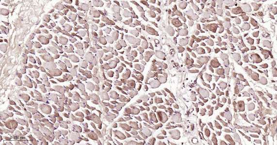 Immunohistochemical analysis of paraffin embedded human skeletal muscle tissue slide using IHC0495H (Human ATG4C IHC Kit).