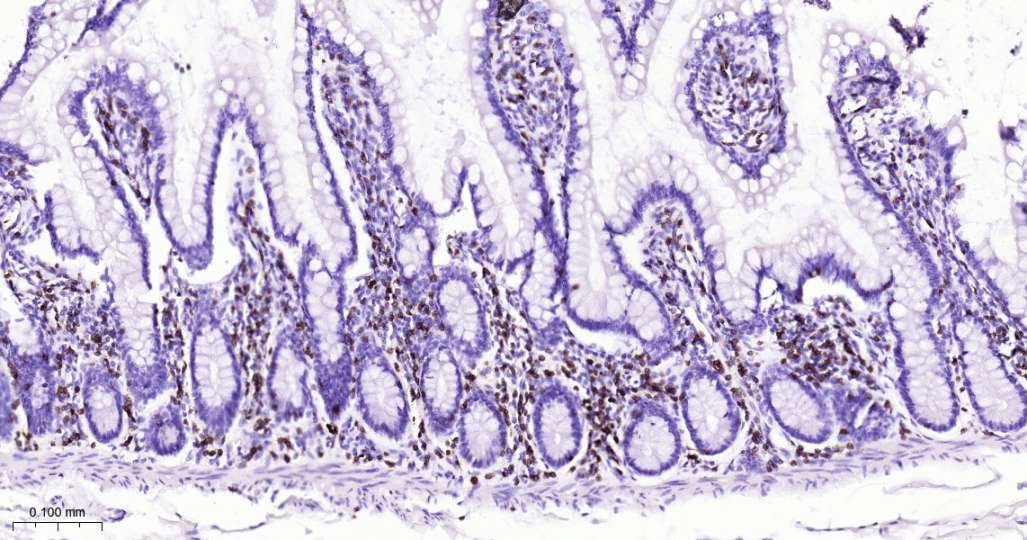 Immunohistochemical analysis of paraffin embedded human small intestine tissue slide using IHC0363 (CD3E Kit).