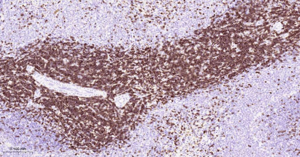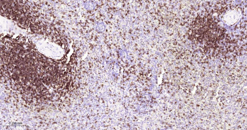 Immunohistochemical analysis of paraffin embedded human spleen tissue slide using IHC0363 (CD3E Kit).