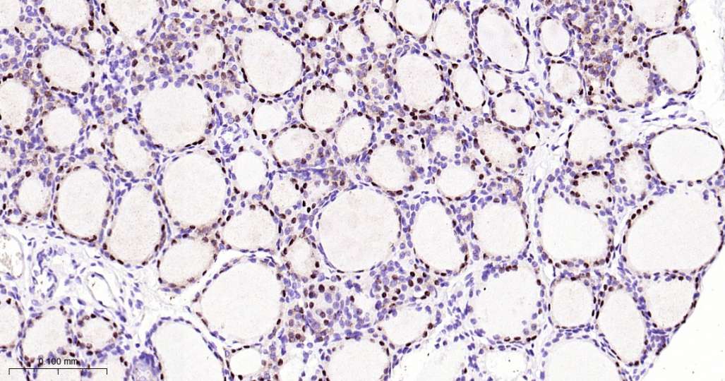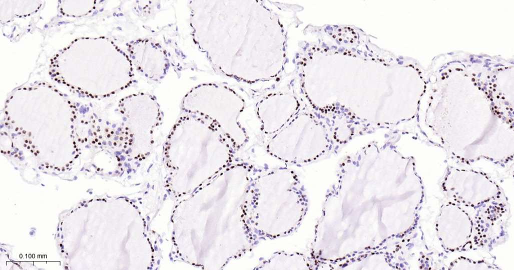 Immunohistochemical analysis of paraffin embedded Human thyroid gland tissue slide using IHC0514 (PAX8 Kit).
