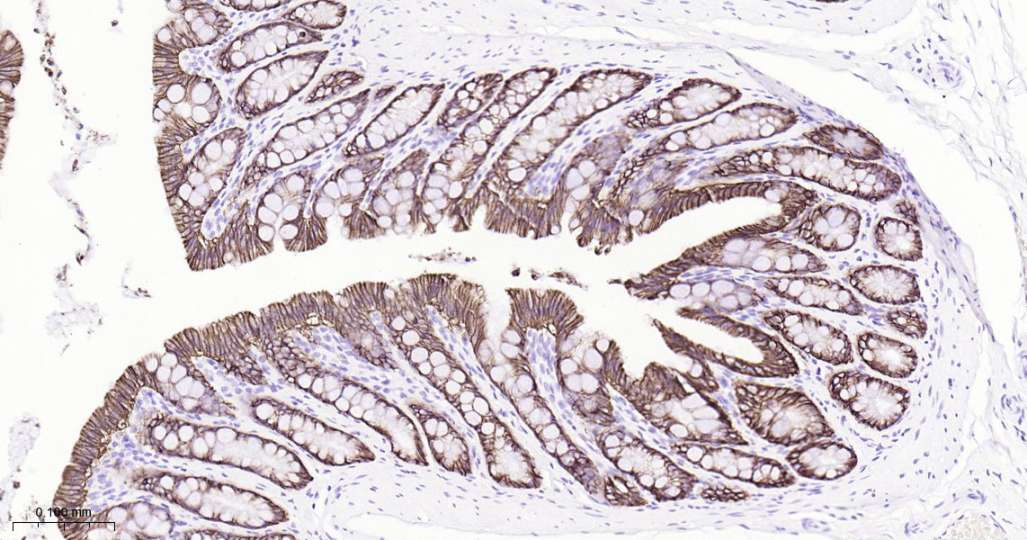 Immunohistochemical analysis of paraffin embedded Rat colon tissue slide using IHC0543R (Rat CLDN7 Kit).