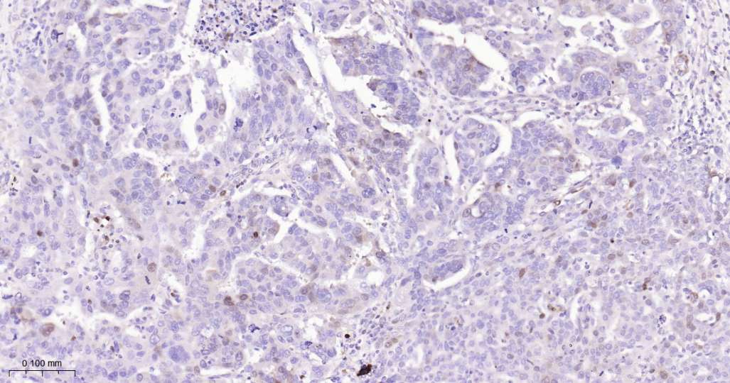 Immunohistochemical analysis of paraffin embedded Human ovarian cancer tissue slide using IHC0545H (Human Thymidylate synthase Kit).