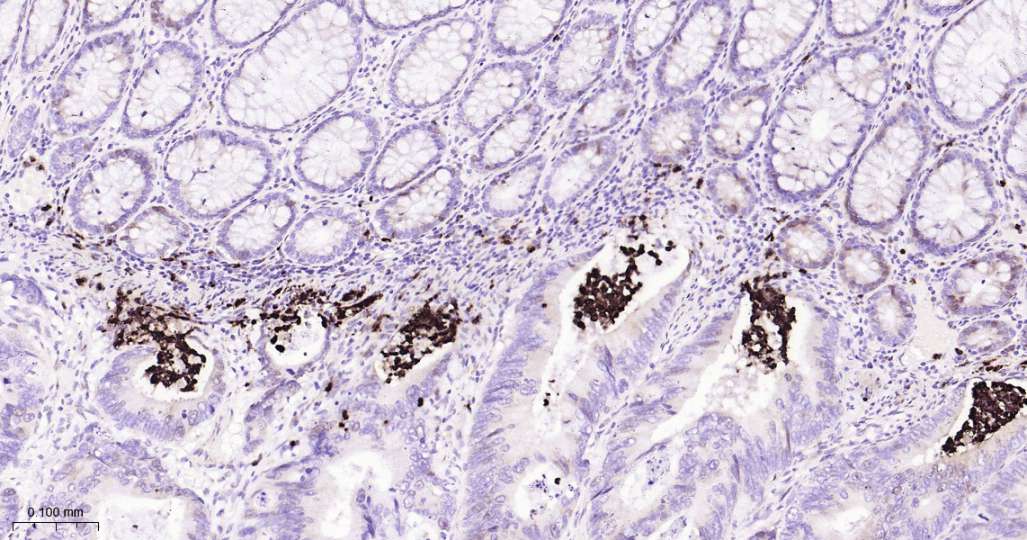 Immunohistochemical analysis of paraffin embedded Human colon cancer tissue slide using IHC0545H (Human Thymidylate synthase Kit).