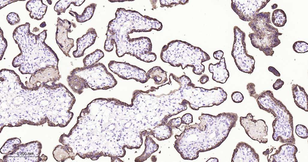 Immunohistochemical analysis of paraffin embedded Human placenta tissue slide using IHC0546H (Human GH1 Kit).