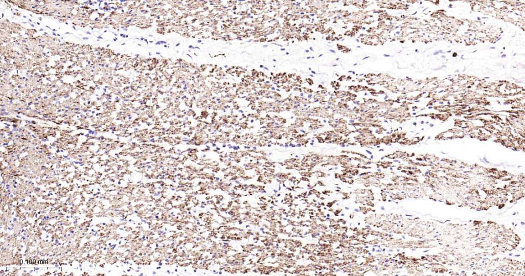 Immunohistochemical analysis of paraffin embedded Human colonic smooth muscle tissue slide using IHC0555 (MYH11 Kit).