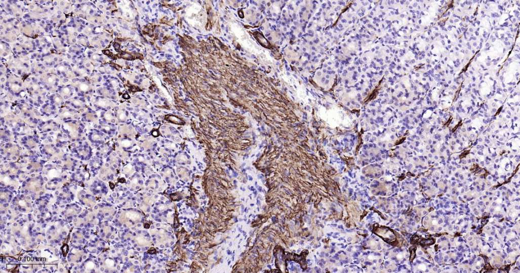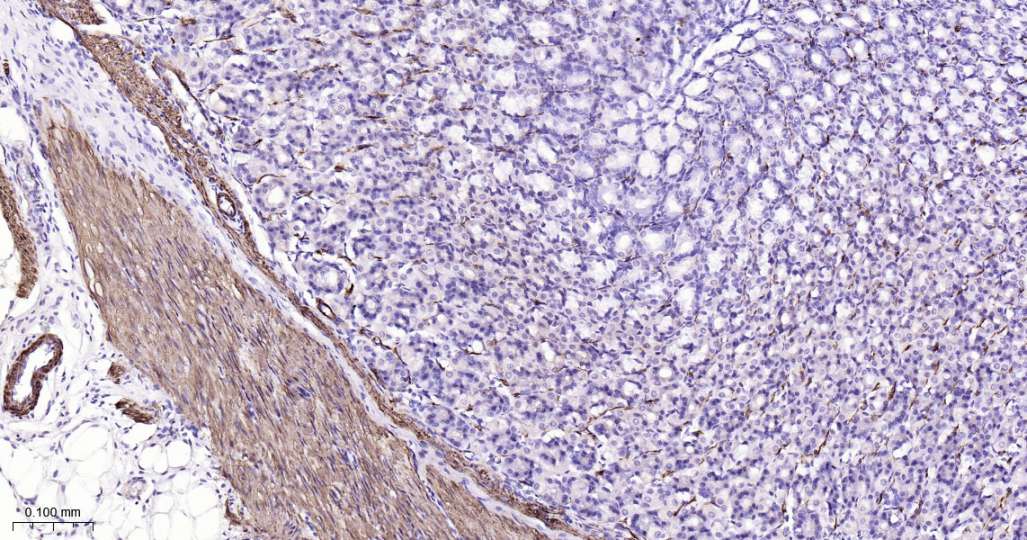 Immunohistochemical analysis of paraffin embedded Mouse stomach tissue slide using IHC0555 (MYH11 Kit).