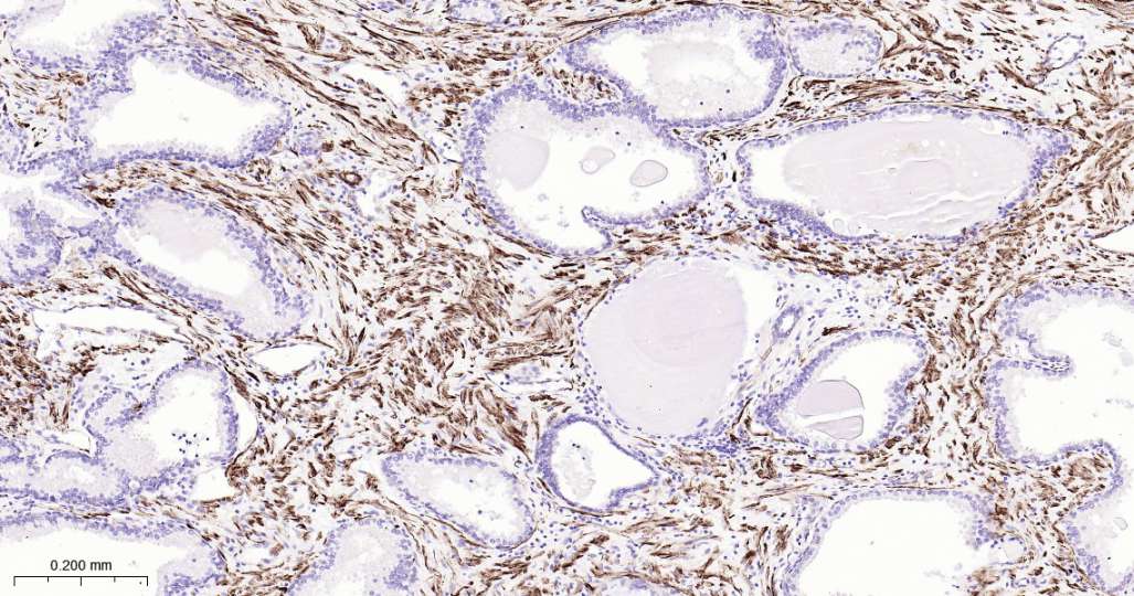 Immunohistochemical analysis of paraffin embedded Human prostate tissue slide using IHC0555H (Human MYH11 Kit).
