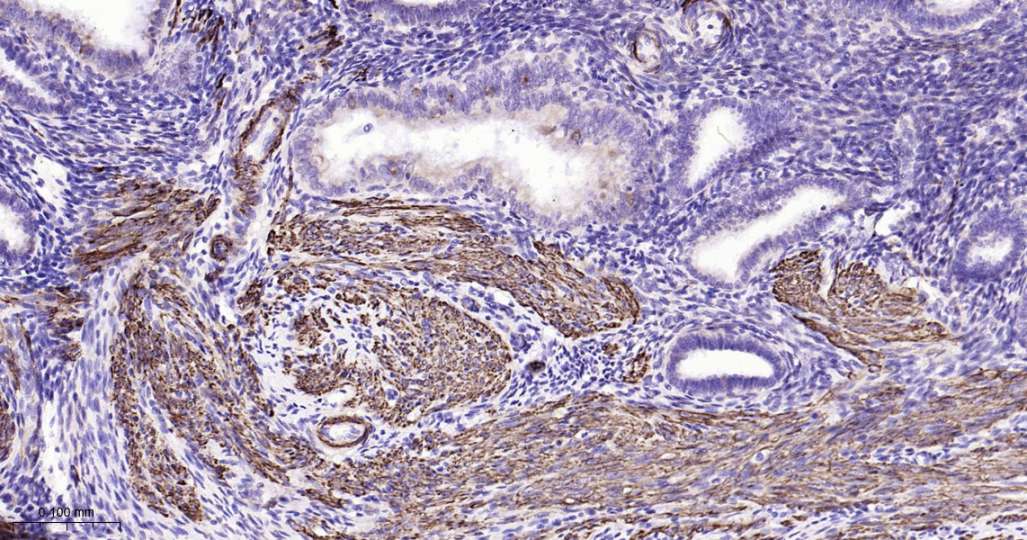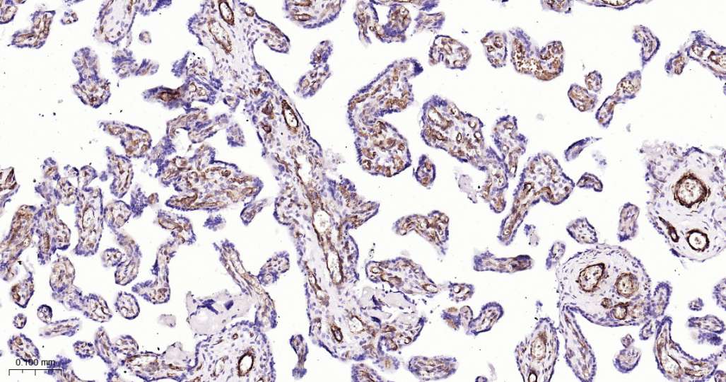 Immunohistochemical analysis of paraffin embedded Human placenta tissue slide using IHC0555H (Human MYH11 Kit).