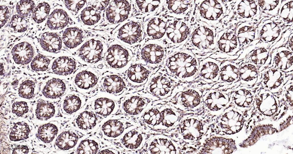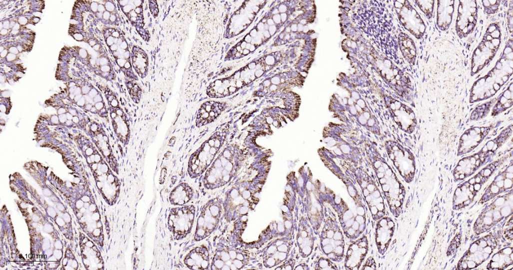 Immunohistochemical analysis of paraffin embedded Mouse colon tissue slide using IHC0559 (Hsp10 Kit).