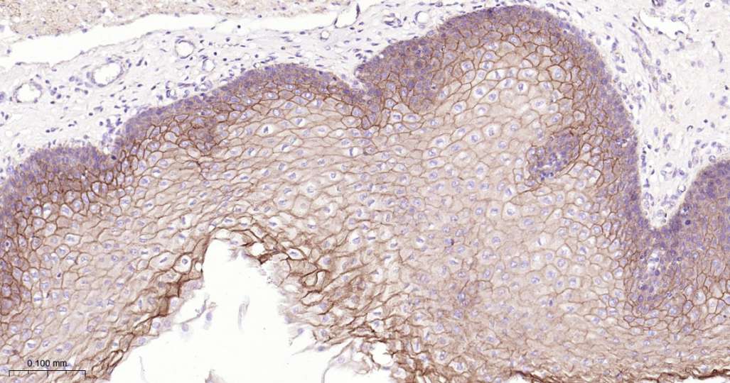 Immunohistochemical analysis of paraffin embedded Human esophagus tissue slide using IHC0567 (delta Catenin Kit).