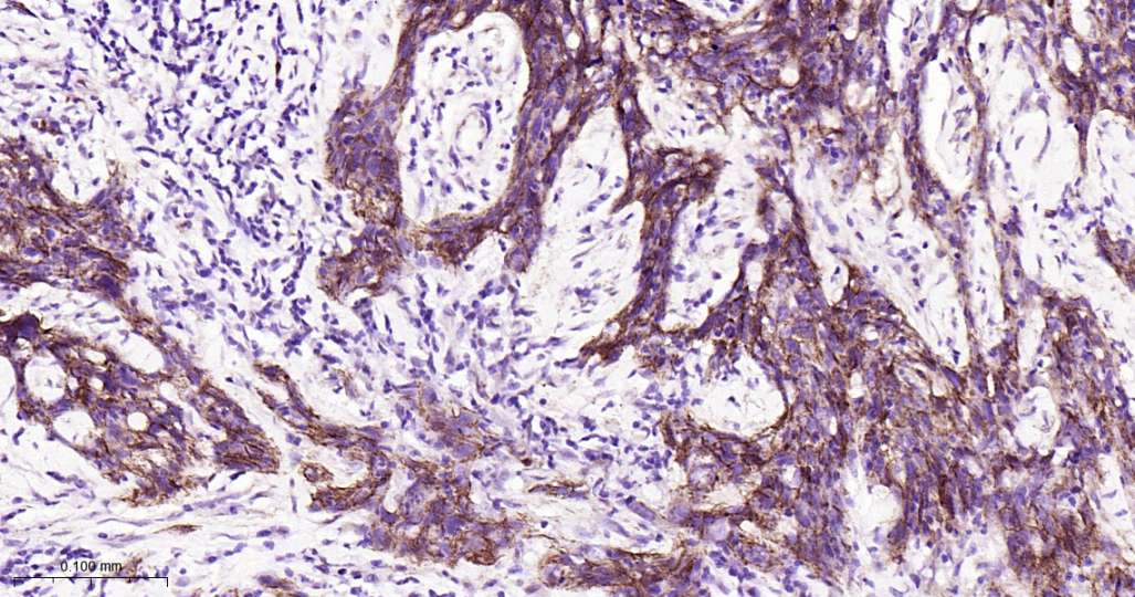 Immunohistochemical analysis of paraffin embedded Human cervical cancer tissue slide using IHC0567H (Human delta Catenin Kit).